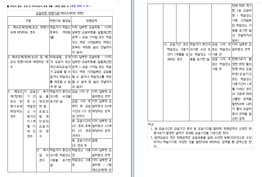 교습비 등 반환기준